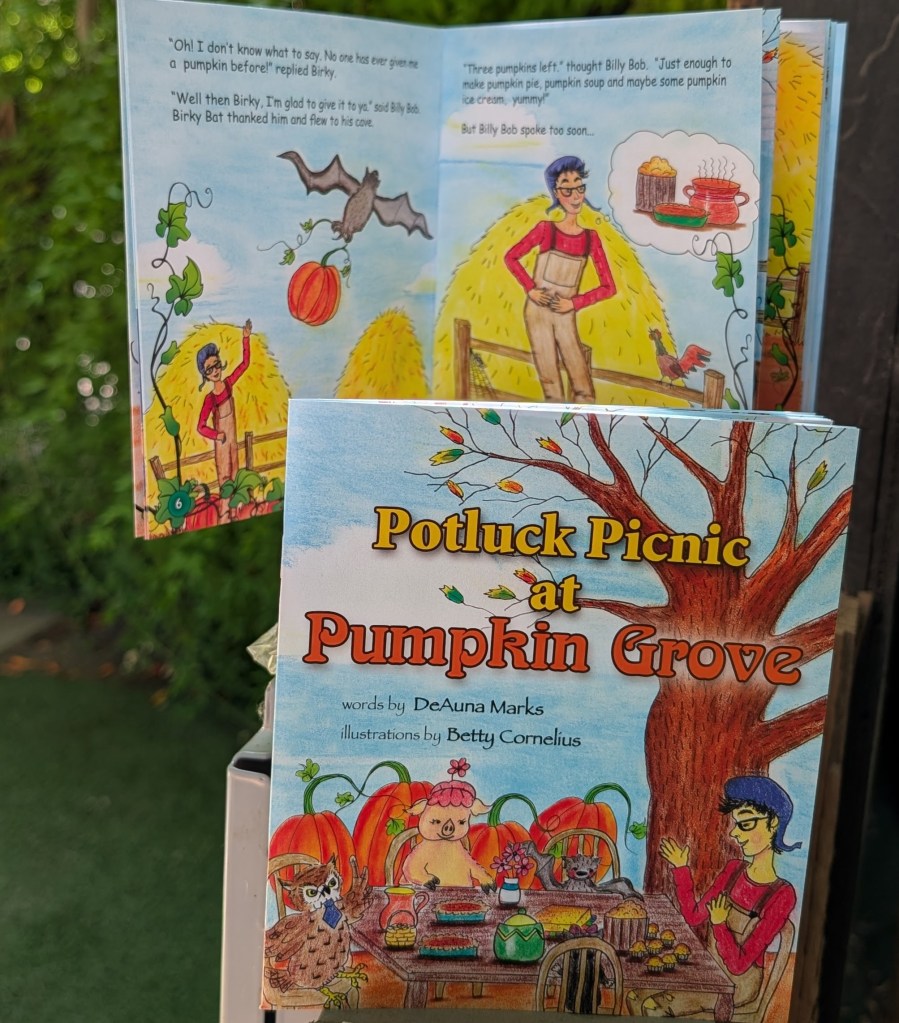Story Time – Groups will gather to hear about the Potluck Picnic at Pumpkin Grove. A story that teaches a wonderful lesson about how Billy Bob shared pumpkins with his friends and they all brought good things back to share with him and each other.